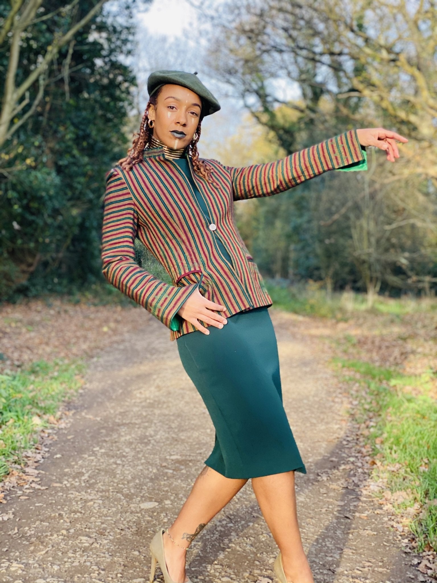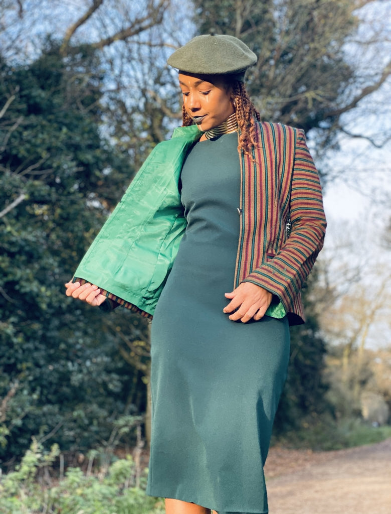 This stunning One-of-a-Kind Afghan Silk Brown, Green and Red Stripe Blazer from Zarif with a Bright Green Lining is the perfect Stand-Out over-layer for any Special Occasion, Event or even at the Office!