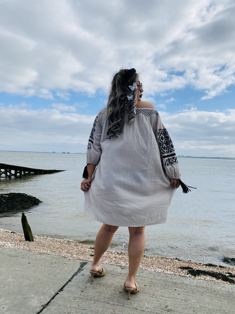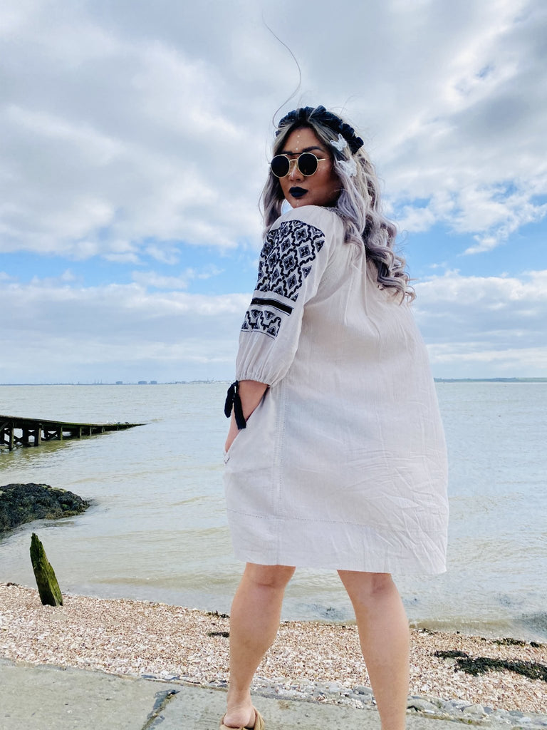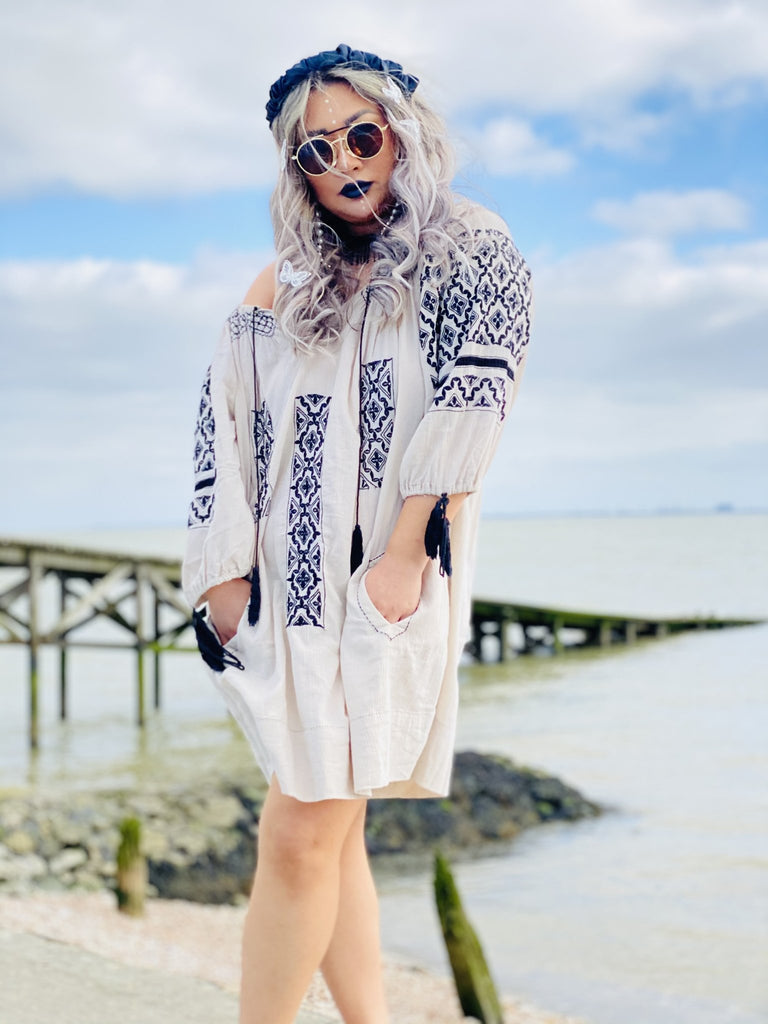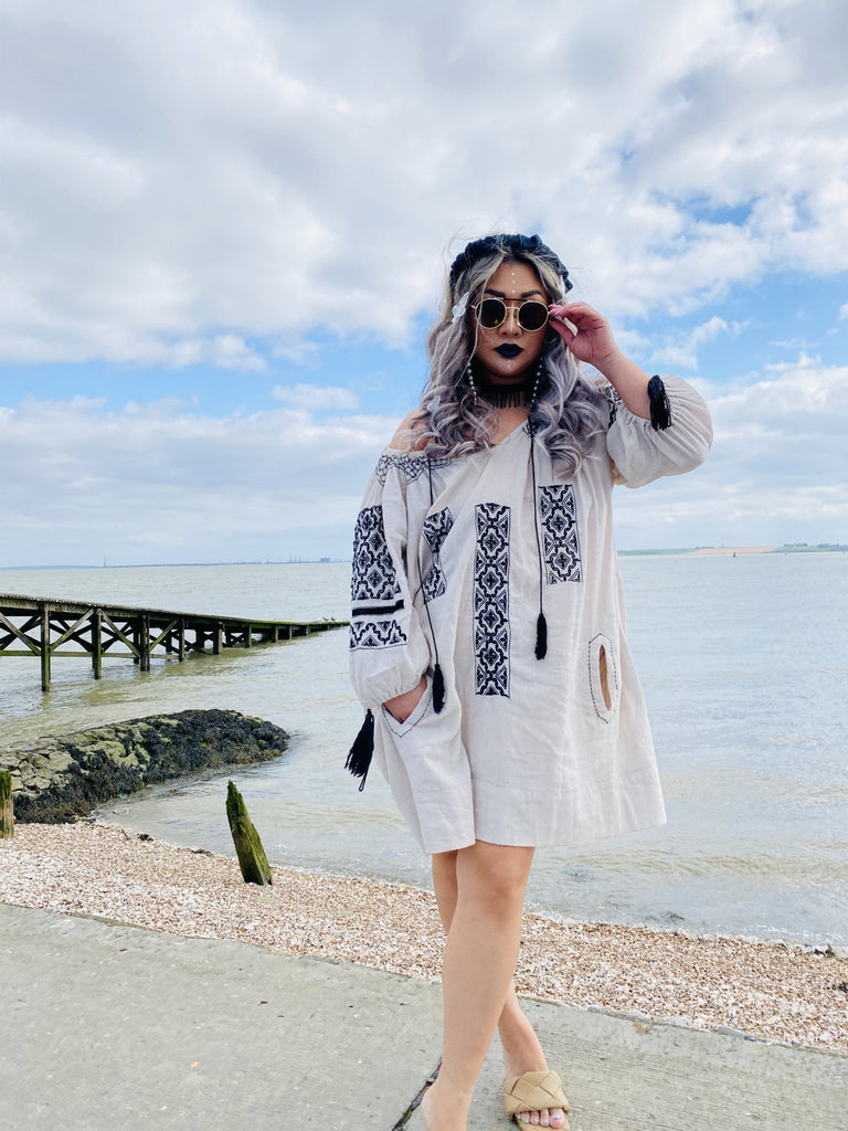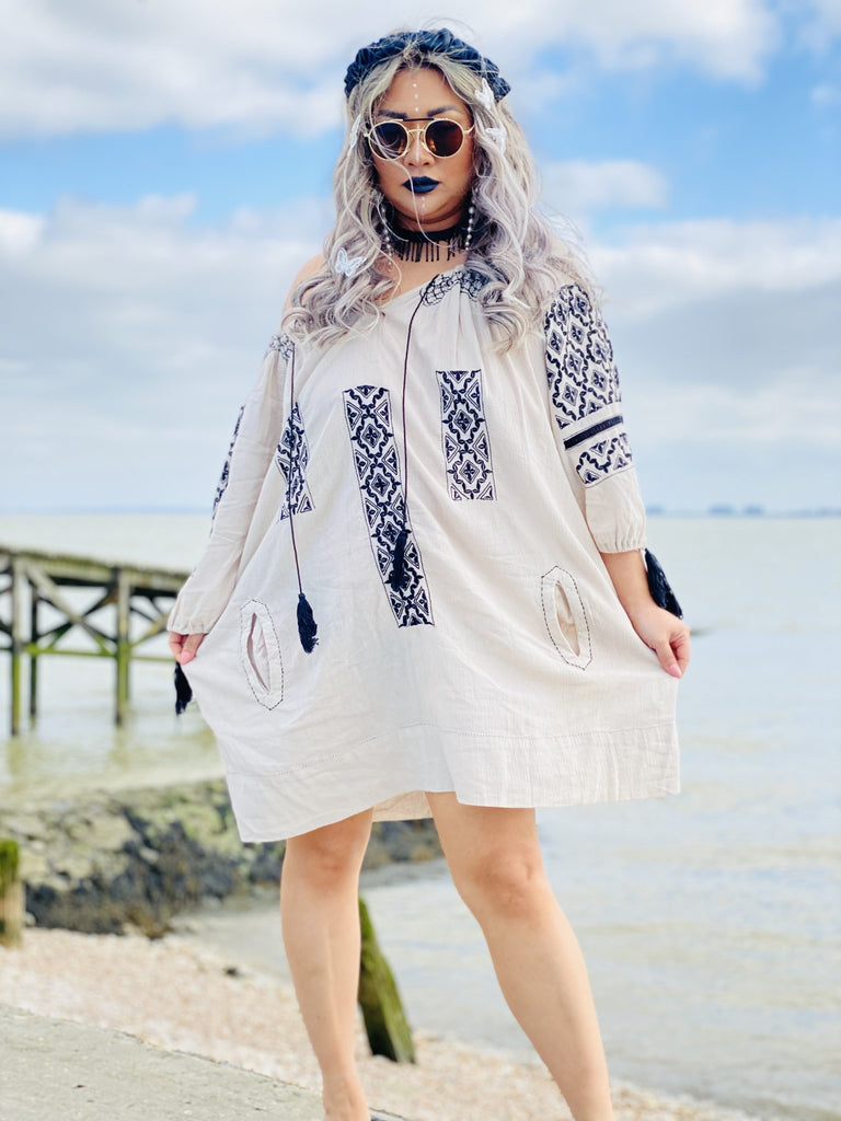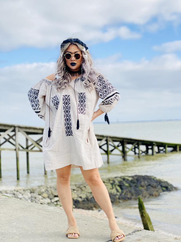 Featuring a bardot, off-shoulder style with two black drawstring tassels in the front, this shirt-dress has stunning black embroidery throughout and two front pockets for extra ease. The dress is just above the knee and can easily be slipped on and off.