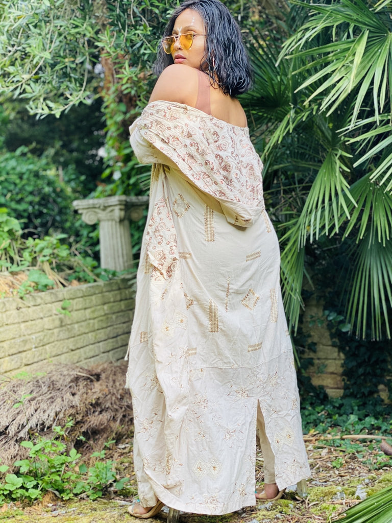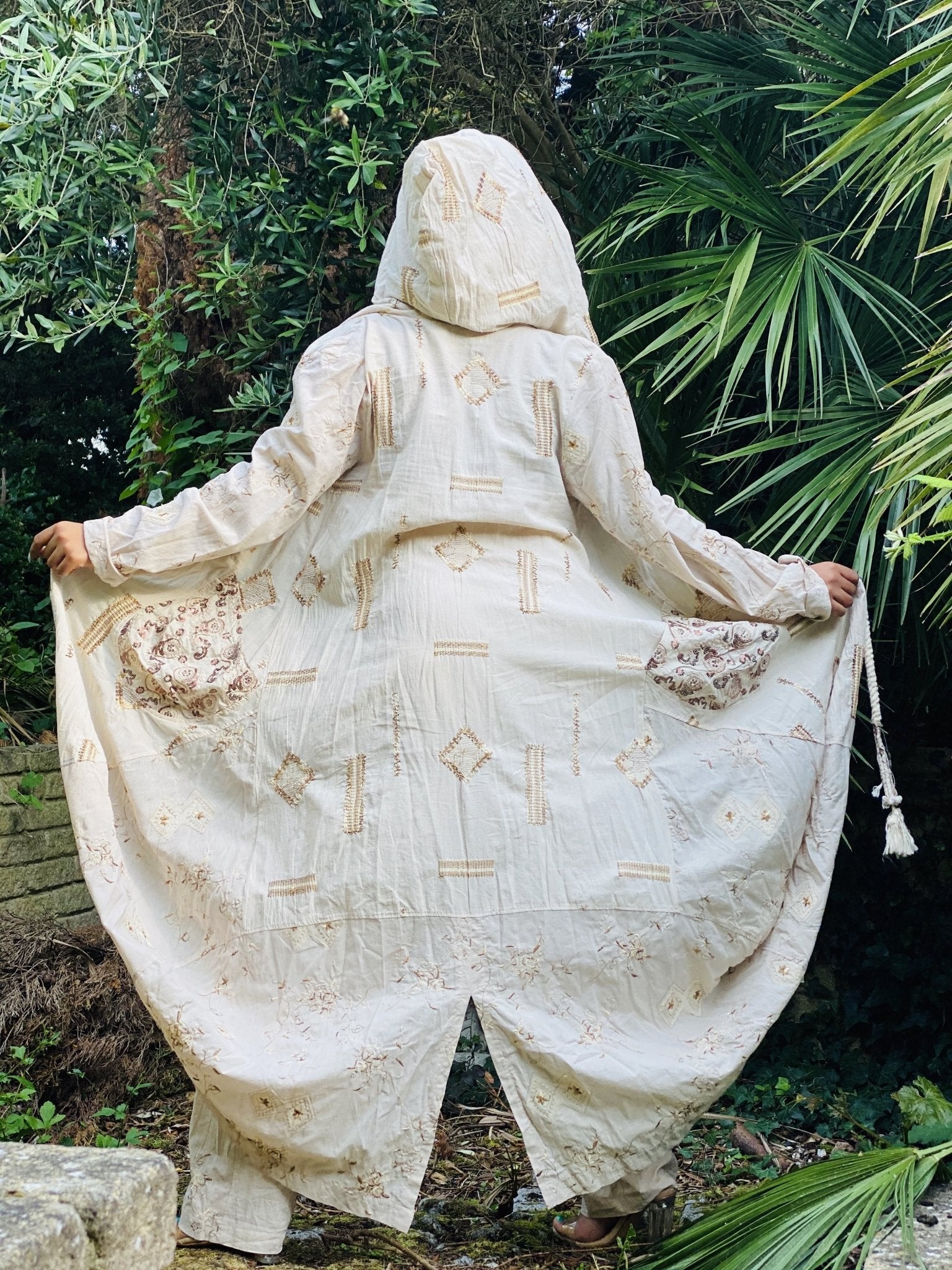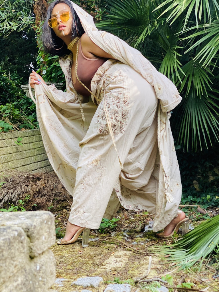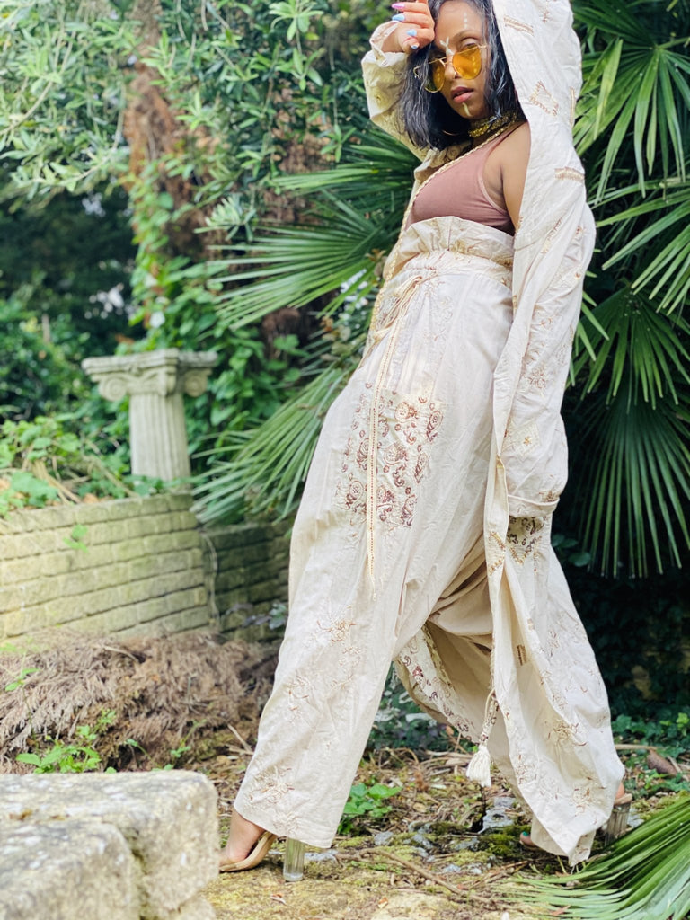 Caraclan fuses its unique and avant-garde style with ready-to-wear pieces where no two collections are the same. These beige harem trousers feature a sequin flower detail wrap overlay with a side tie and further detailed side pockets to truly make a statement, with an elastic waist making it truly a one size fits all outfit! The awesome matching maxi coat also features a wide hood and side pockets encrusted with the bronze sequins detail and two long rope tassels to fasten at the centre if desired!