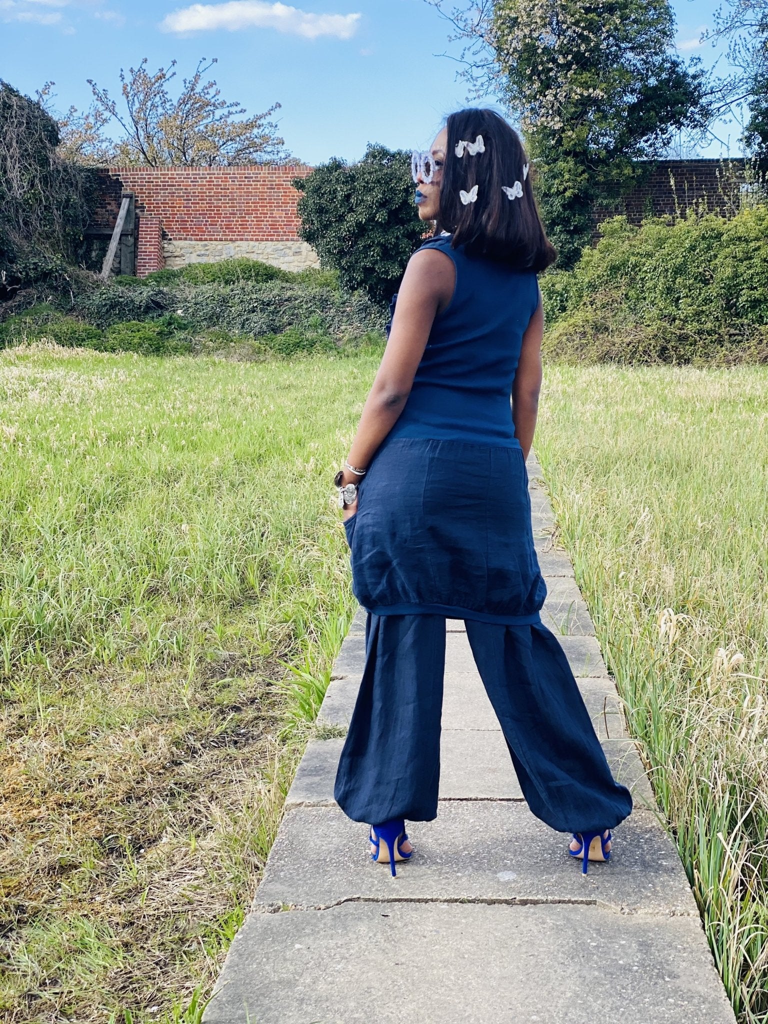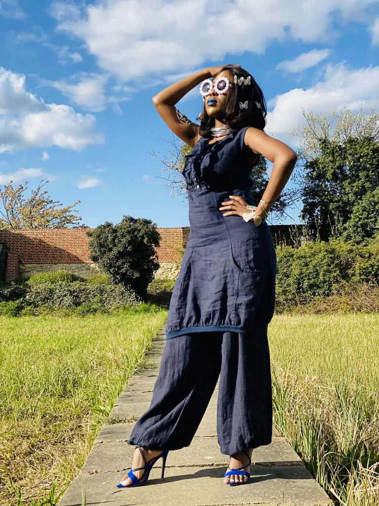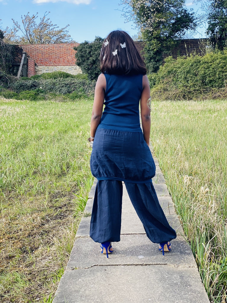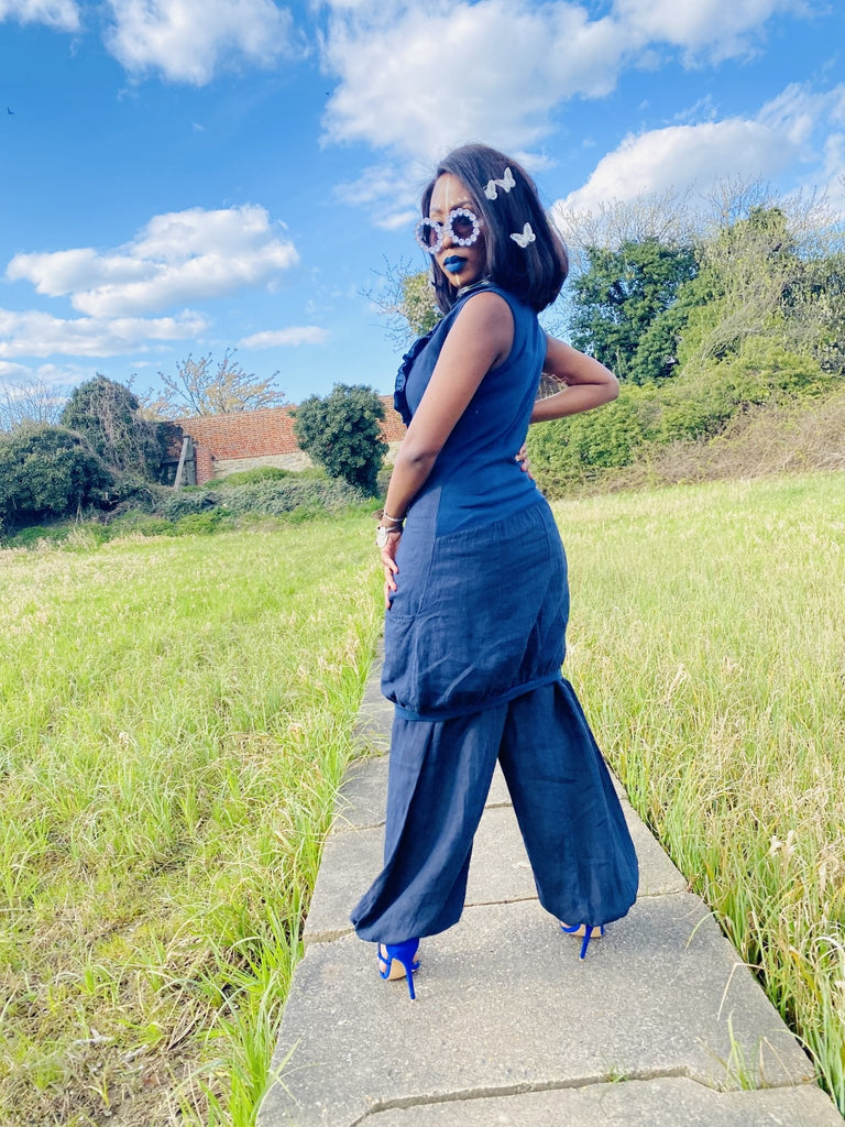 This Beautiful Navy Linen Cuffed Trousers and Sleeveless Fitted Tunic with Ruffles is perfect for any Sunday Brunch, the Office or cruising along the Beach on Holiday!