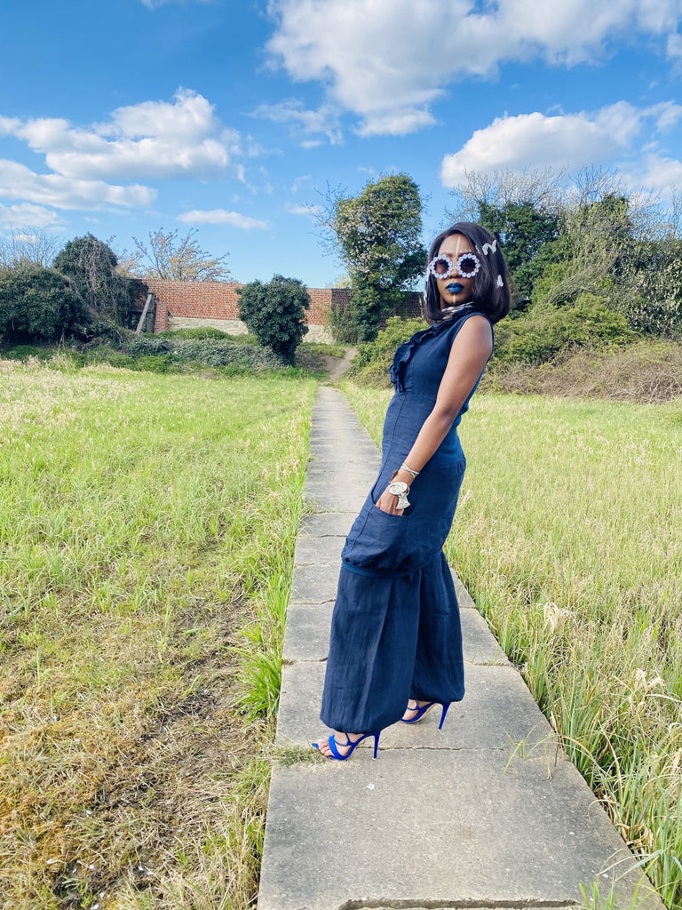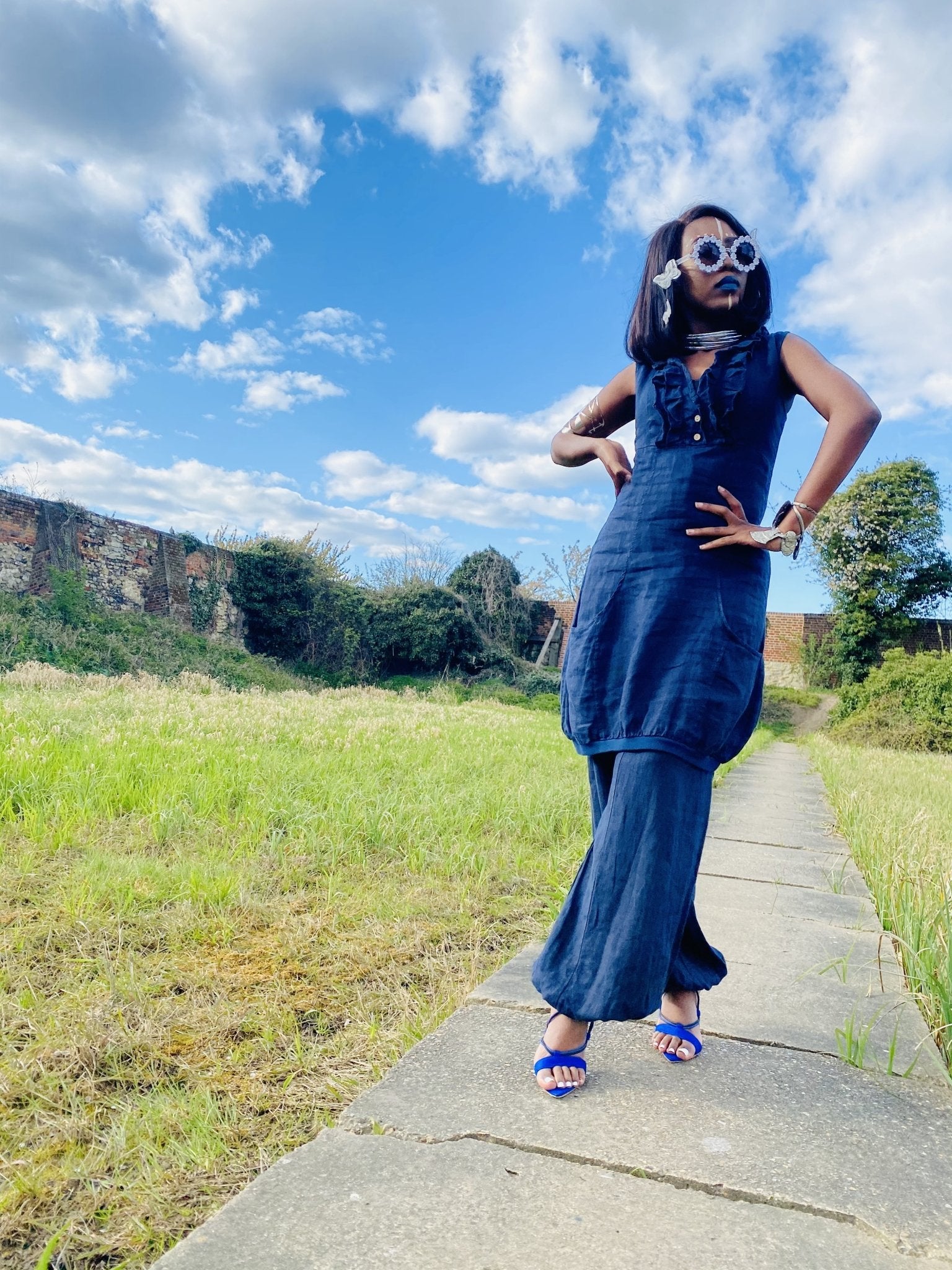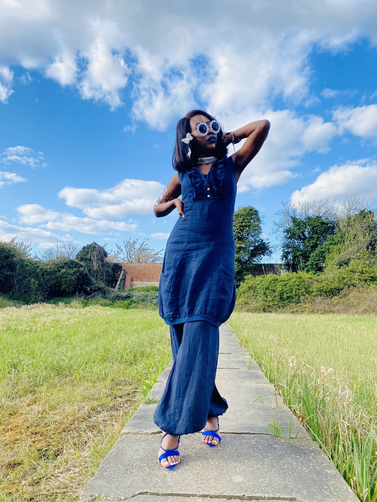 This Beautiful Navy Linen Cuffed Trousers and Sleeveless Fitted Tunic with Ruffles is perfect for any Sunday Brunch, the Office or cruising along the Beach on Holiday!