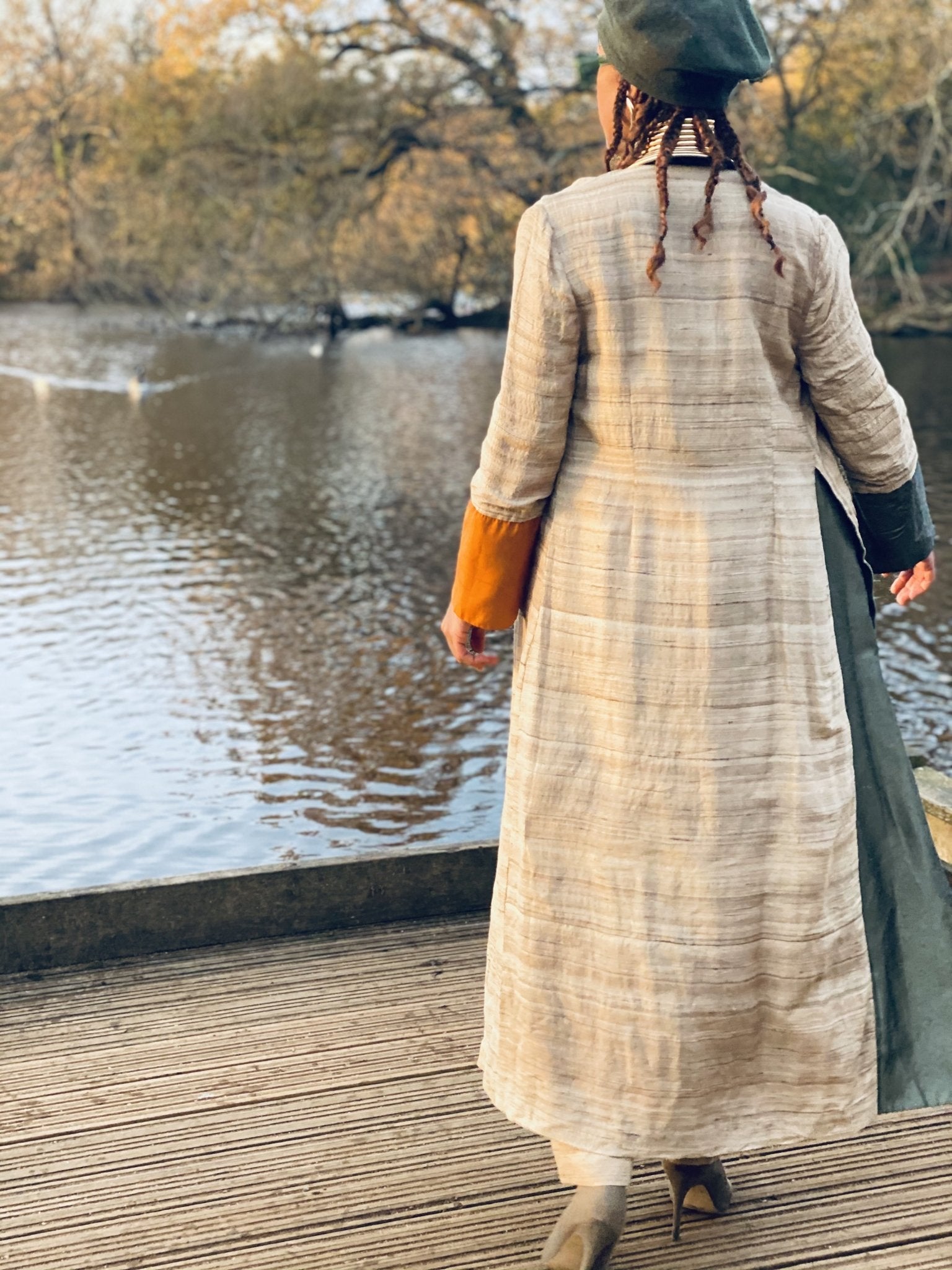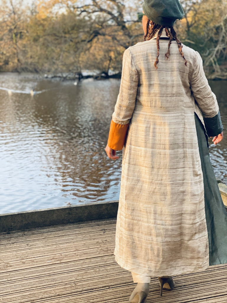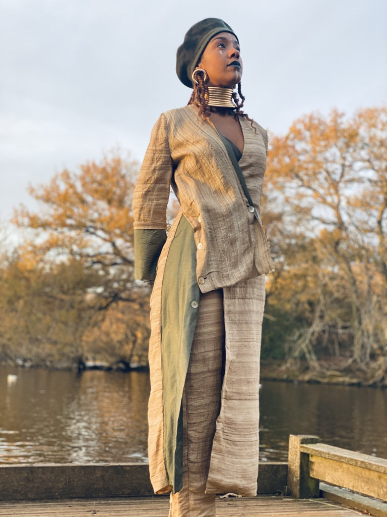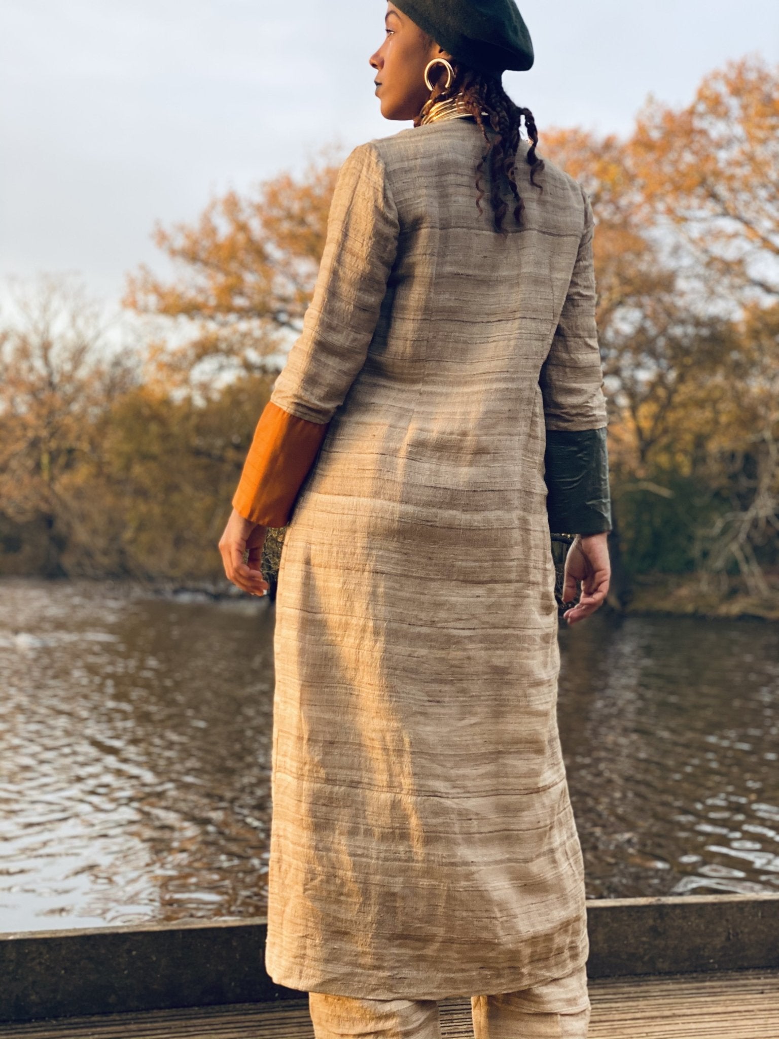 This incredible Handmade, One-of-a-Kind Raw Silk Maxi Wrap Coat with Olive + Tangerine Silk Panels + matching Trousers from Zarif is the perfect statement outfit for any Special Occasion, Work Meeting or Formal Festivities where you want to stand out!