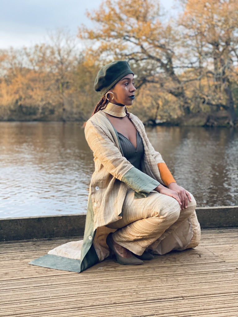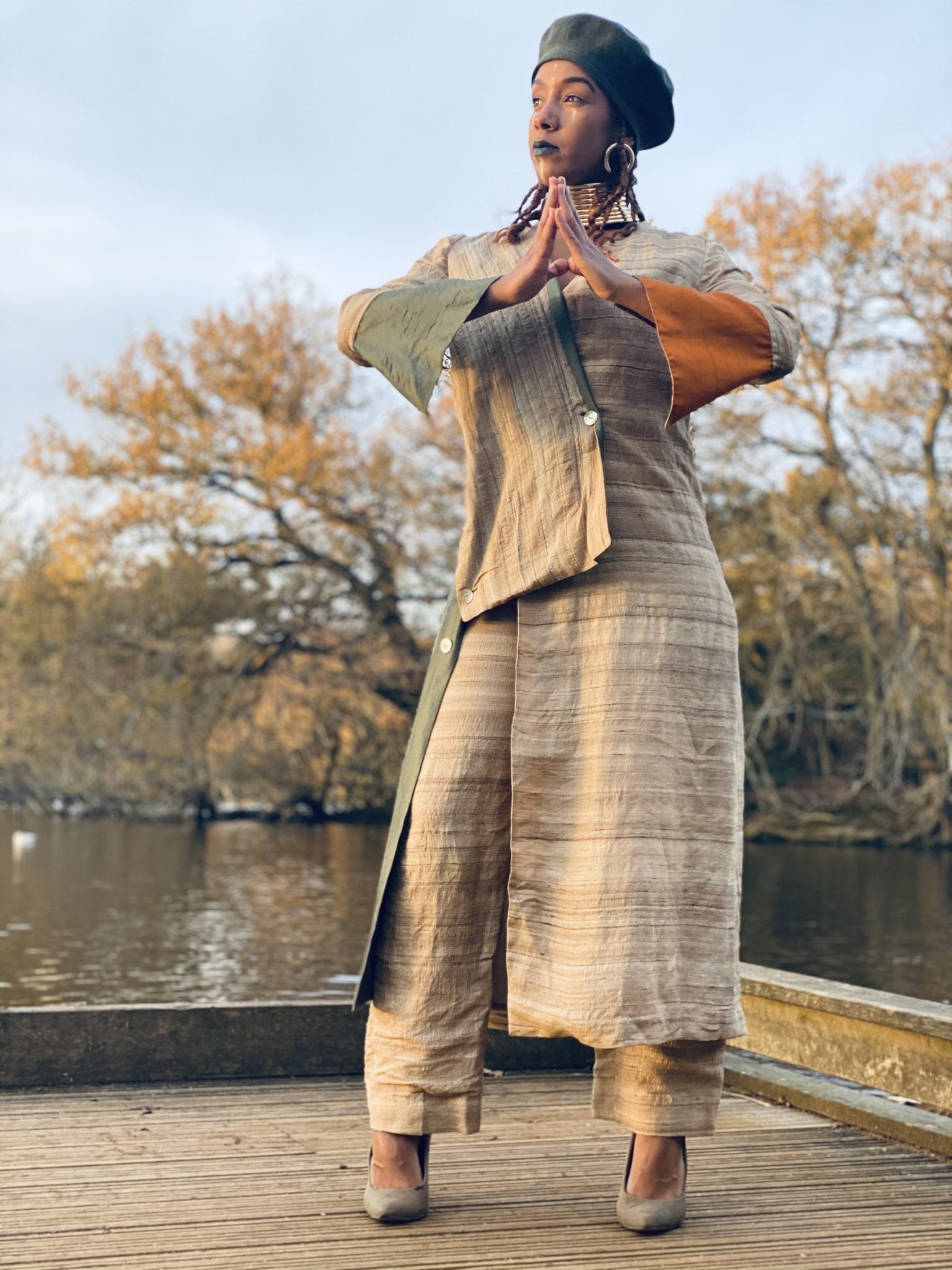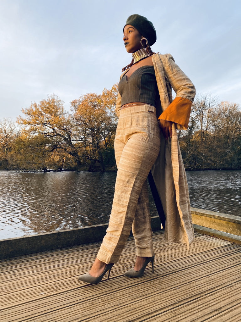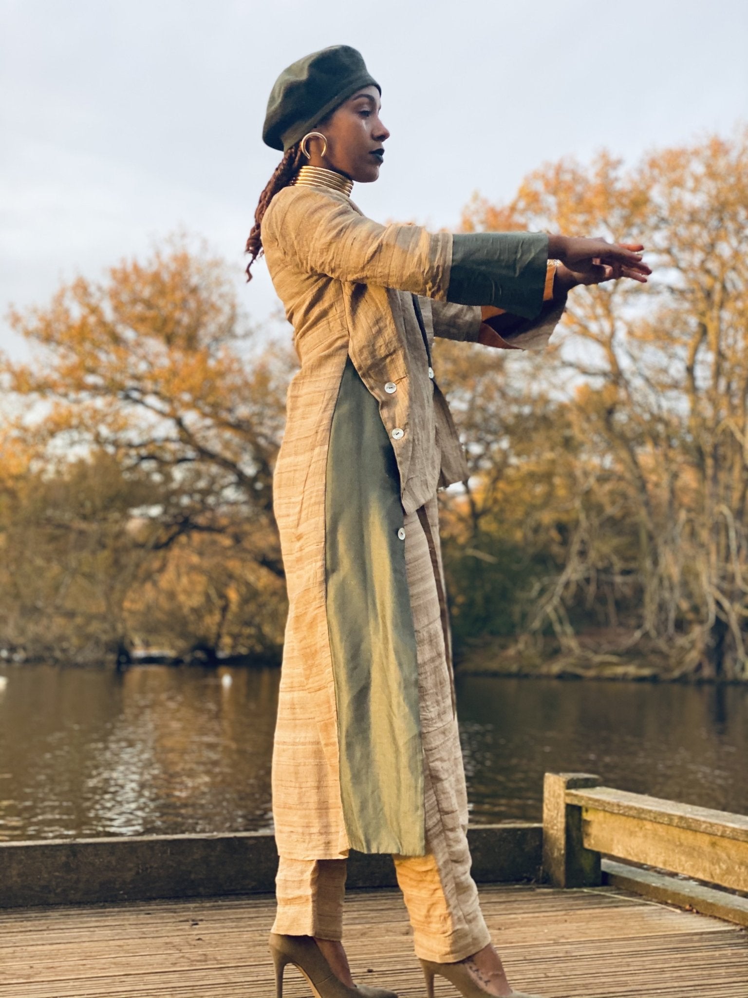This incredible Handmade, One-of-a-Kind Raw Silk Maxi Wrap Coat with Olive + Tangerine Silk Panels + matching Trousers from Zarif is the perfect statement outfit for any Special Occasion, Work Meeting or Formal Festivities where you want to stand out!