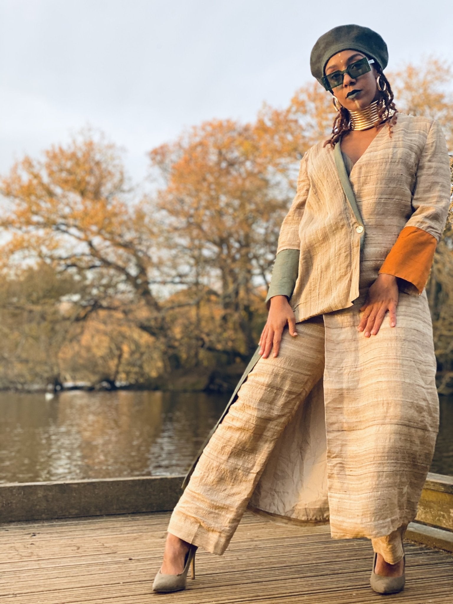 The Zarif collection is produced in Kabul, by local Afghan artisans, practicing the art of "slow production," fostering fair-trade practices and the use of natural dyes. Featuring stunning orange and green silk cuffs and side panel along the jacket this natural raw silk fabric comes fitted with a comfortable lining. The jacket is cropped in the front and buttons diagonally. The trousers are straight leg with a side zip + fasten for extra ease.