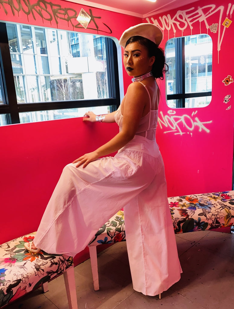 Featuring side pockets with a thick cream elasticated waist-band with belt loops and a super flared leg.